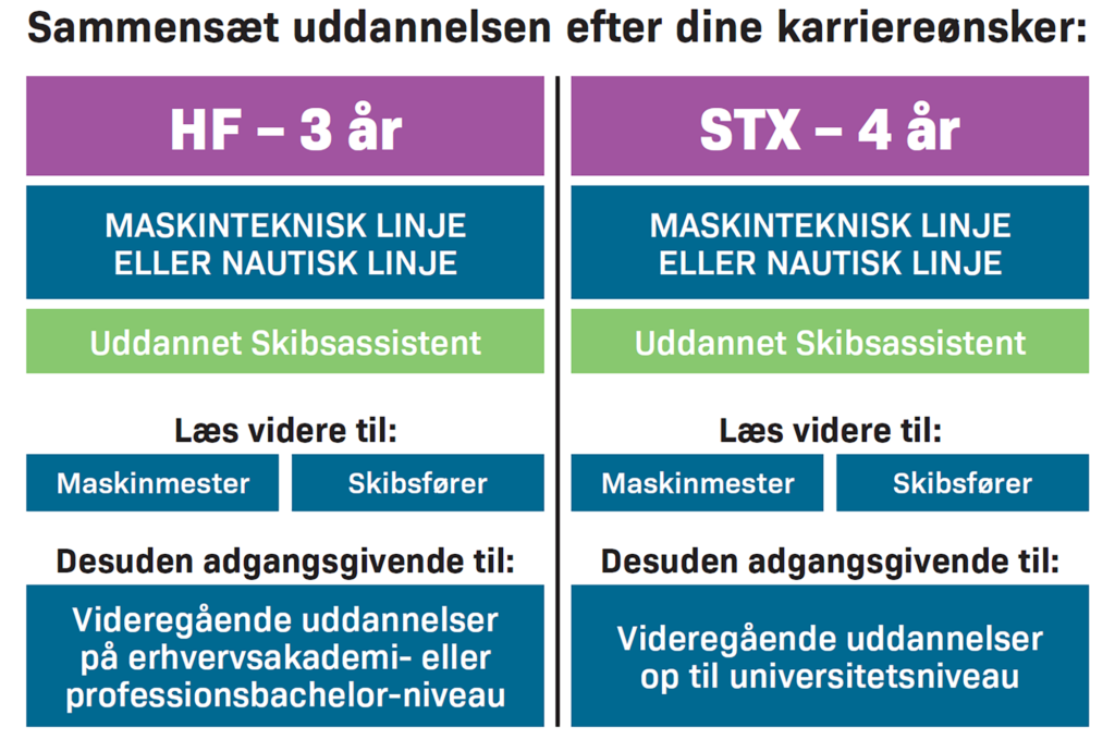 Både HF og STX giver ½ års merit på de videregående professionsbacheloruddannelser til maskinmester og skibsfører. Du kan også læse videre til skibsfører på den konventionelle uddannelse. Både maskinmester- og skibsfører-uddannelserne giver mulighed for jobs både til søs og på land.