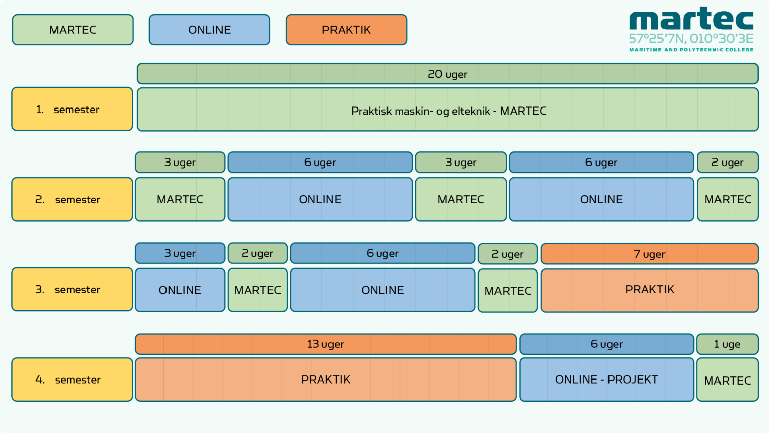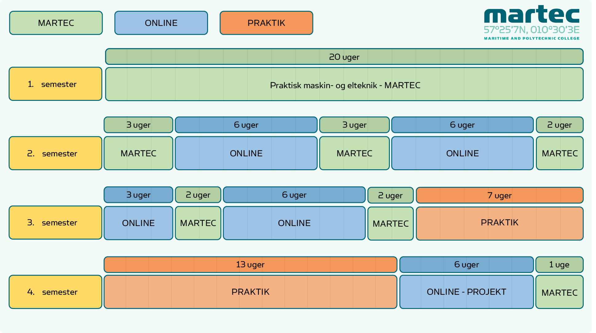 Første halvdel af 2. semester er projektperiode og denne foregår i den store projekthal på MARTEC i Frederikshavn og anden halvdel af 2. semester er en del af praktikken.