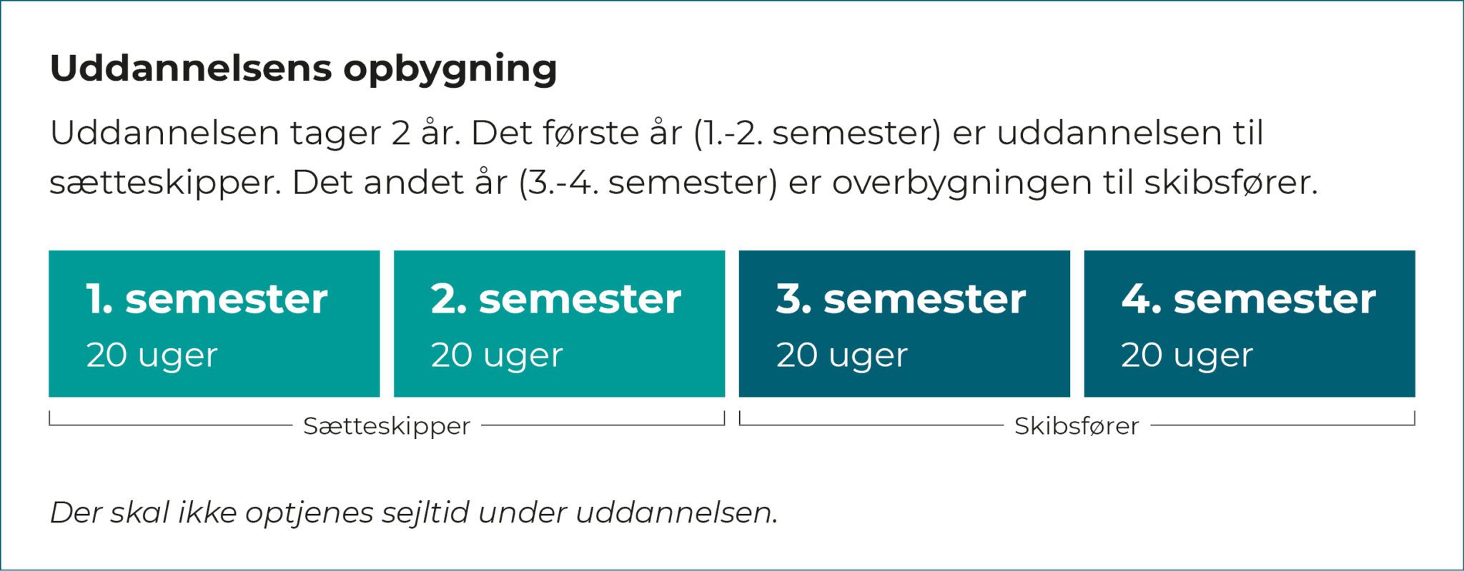 Uddannelsen består af 4 semestre og varer 2 år. Er du sætteskipper, får du merit for de to første semestre og starter dermed direkte på uddannelsens 3. semester.